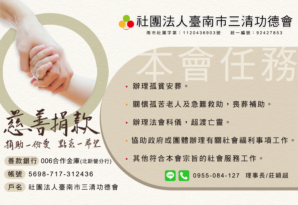 懇請社會大眾與社團法人臺南市三清功德會一同攜手回饋社會